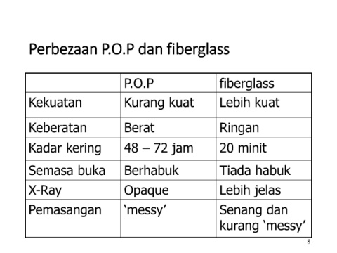 Perbezaan P.O.P dan fiberglass P.O.P fiberglass Kekuatan Kurang kuat Lebih kuat Keberatan Berat Ringan Kadar kering 48 – 72 jam 20 minit Semasa buka Berhabuk Tiada habuk X-Ray Opaque Lebih jelas Pemasangan ‘messy’ Senang dan kurang ‘messy’ 8