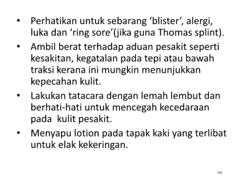 luka dan ‘ring sore’(jika guna Thomas splint).