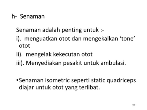h- Senaman Senaman adalah penting untuk :- i). menguatkan otot dan mengekalkan ‘tone’ otot ii). mengelak kekecutan otot iii). Menyediakan pesakit untuk ambulasi. •Senaman isometric seperti static quadriceps diajar untuk otot yang terlibat. 109