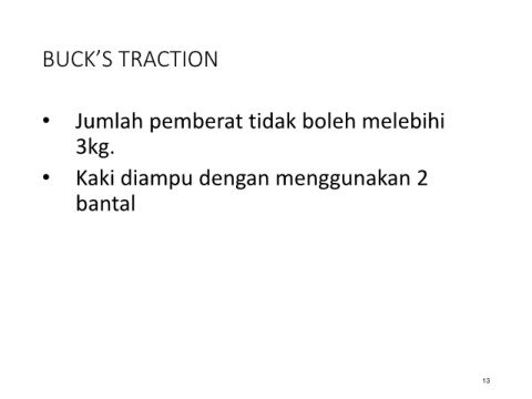 BUCK’S TRACTION • Jumlah pemberat tidak boleh melebihi 3kg. • Kaki diampu dengan menggunakan 2 bantal 13