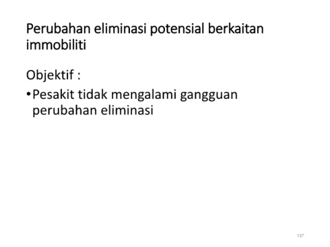 Perubahan eliminasi potensial berkaitan immobiliti Objektif : •Pesakit tidak mengalami gangguan perubahan eliminasi 137