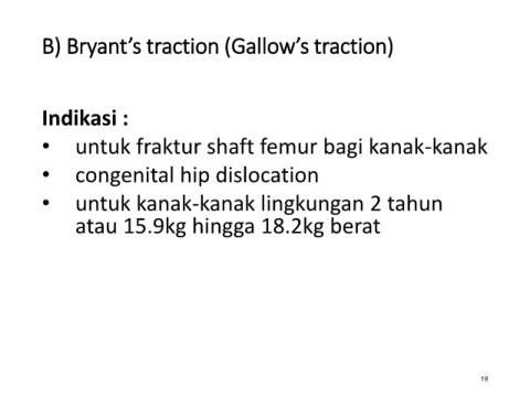 B) Bryant’s traction (Gallow’s traction) Indikasi : • untuk fraktur shaft femur bagi kanak-kanak • congenital hip dislocation • untuk kanak-kanak lingkungan 2 tahun atau 15.9kg hingga 18.2kg berat 19