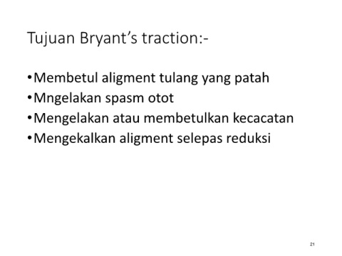 Tujuan Bryant’s traction:- •Membetul aligment tulang yang patah •Mngelakan spasm otot •Mengelakan atau membetulkan kecacatan •Mengekalkan aligment selepas reduksi 21