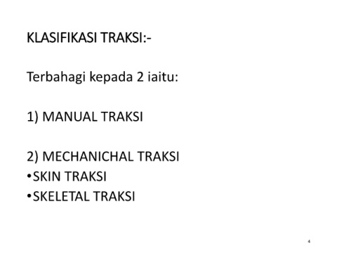 KLASIFIKASI TRAKSI:- Terbahagi kepada 2 iaitu: 1) MANUAL TRAKSI 2) MECHANICHAL TRAKSI •SKIN TRAKSI •SKELETAL TRAKSI 4