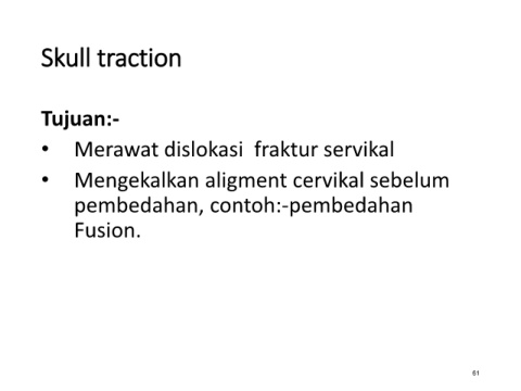 Skull traction Tujuan:- • Merawat dislokasi fraktur servikal • Mengekalkan aligment cervikal sebelum pembedahan, contoh:-pembedahan Fusion. 61