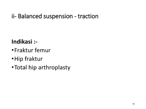 ii- Balanced suspension - traction Indikasi :- •Fraktur femur •Hip fraktur •Total hip arthroplasty 78