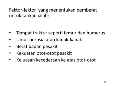 Faktor-faktor yang menentukan pemberat untuk tarikan ialah:- • Tempat fraktur seperti femur dan humerus • Umur berusia atau kanak-kanak • Berat badan pesakit • Kekuatan otot-otot pesakit • Keluasan kecederaan ke atas otot-otot 89