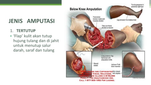 JENIS AMPUTASI 1. TERTUTUP • ‘Flap’ kulit akan tutup hujung tulang dan di jahit untuk menutup salur darah, saraf dan tulang