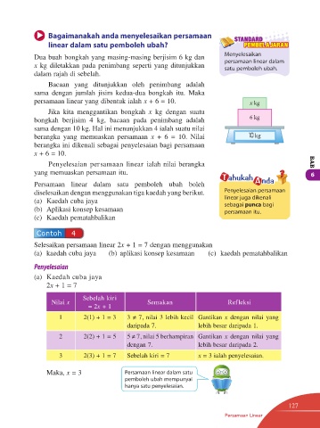 3 2(3) + 1 = 7 Sebelah kiri = 7 x = 3 ialah penyelesaian.
