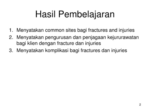 Hasil Pembelajaran 1. Menyatakan common sites bagi fractures and injuries 2. Menyatakan pengurusan dan penjagaan kejururawatan bagi klien dengan fracture dan injuries 3. Menyatakan komplikasi bagi fractures dan injuries 2
