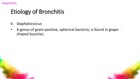 CikguOnline CikguOnline Etiology of Bronchitis b. Staphylococcus • A genus of gram-positive, spherical bacteria, is found in grape - shaped bunches. 17