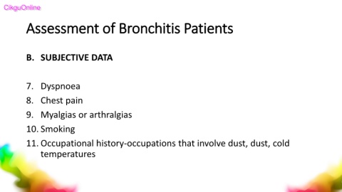 CikguOnline CikguOnline Assessment of Bronchitis Patients B. SUBJECTIVE DATA 7. Dyspnoea 8. Chest pain 9. Myalgias or arthralgias 10. Smoking 11. Occupational history-occupations that involve dust, dust, cold temperatures 33 33 33 33