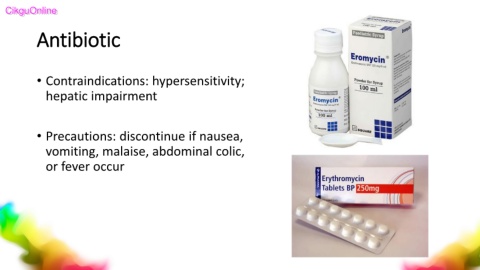 CikguOnline CikguOnline Antibiotic • Contraindications: hypersensitivity; hepatic impairment • Precautions: discontinue if nausea, vomiting, malaise, abdominal colic, or fever occur 37 37 37 37 37