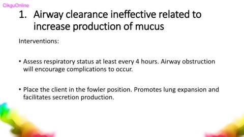 • Assess respiratory status at least every 4 hours. Airway obstruction