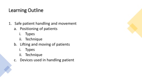 Learning Outline 1. Safe patient handling and movement a. Positioning of patients i. Types ii. Technique b. Lifting and moving of patients i. Types ii. Technique c. Devices used in handling patient