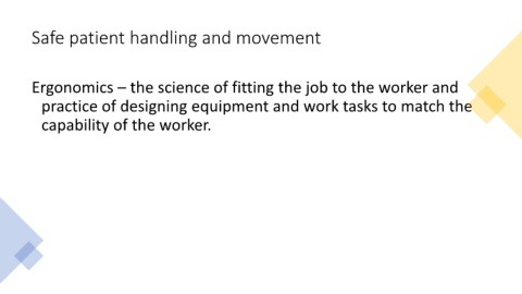 Safe patient handling and movement Ergonomics – the science of fitting the job to the worker and practice of designing equipment and work tasks to match the capability of the worker.