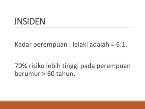 INSIDEN Kadar perempuan : lelaki adalah = 6:1. 70% risiko lebih tinggi pada perempuan berumur > 60 tahun.
