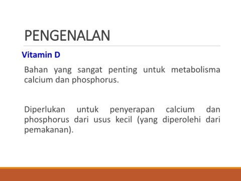 PENGENALAN Vitamin D Bahan yang sangat penting untuk metabolisma calcium dan phosphorus. Diperlukan untuk penyerapan calcium dan phosphorus dari usus kecil (yang diperolehi dari pemakanan).