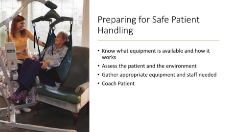 Preparing for Safe Patient Handling • Know what equipment is available and how it works • Assess the patient and the environment • Gather appropriate equipment and staff needed • Coach Patient