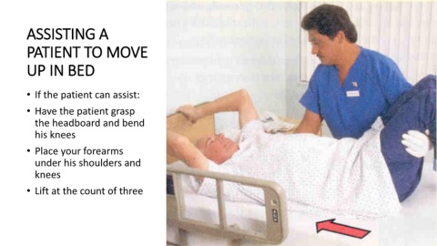 ASSISTING A PATIENT TO MOVE UP IN BED • If the patient can assist: • Have the patient grasp the headboard and bend his knees • Place your forearms under his shoulders and knees • Lift at the count of three