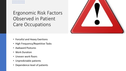 Ergonomic Risk Factors Observed in Patient Care Occupations • Forceful and Heavy Exertions • High Frequency/Repetitive Tasks • Awkward Postures • Work Duration • Uneven work floors • Unpredictable patients • Dependence level of patients