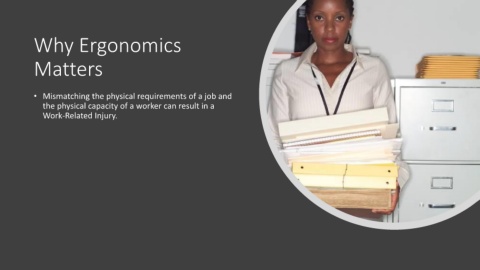 Why Ergonomics Matters • Mismatching the physical requirements of a job and the physical capacity of a worker can result in a Work-Related Injury.