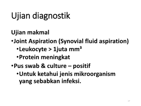 Ujian diagnostik Ujian makmal •Joint Aspiration (Synovial fluid aspiration) •Leukocyte > 1juta mm³ •Protein meningkat •Pus swab & culture – positif •Untuk ketahui jenis mikroorganism yang sebabkan infeksi. 17