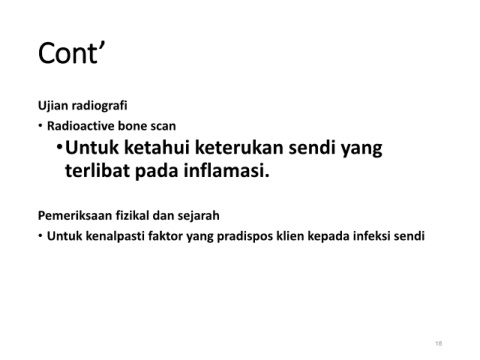 Cont’ Ujian radiografi • Radioactive bone scan •Untuk ketahui keterukan sendi yang terlibat pada inflamasi. Pemeriksaan fizikal dan sejarah • Untuk kenalpasti faktor yang pradispos klien kepada infeksi sendi 18