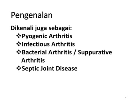 Pengenalan Dikenali juga sebagai: ❖Pyogenic Arthritis ❖Infectious Arthritis ❖Bacterial Arthritis / Suppurative Arthritis ❖Septic Joint Disease 4