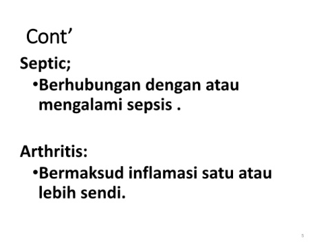 Cont’ Septic; •Berhubungan dengan atau mengalami sepsis . Arthritis: •Bermaksud inflamasi satu atau lebih sendi. 5