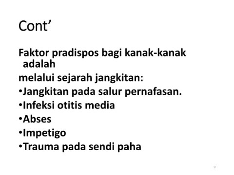 Cont’ Faktor pradispos bagi kanak-kanak adalah melalui sejarah jangkitan: •Jangkitan pada salur pernafasan. •Infeksi otitis media •Abses •Impetigo •Trauma pada sendi paha 9