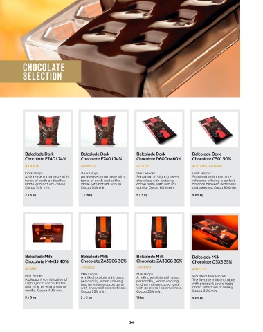 Cocoa 74% min. Cocoa 74% min. vanilla. Cocoa 60% min. and sweetness. Cocoa 50% min. Perfectly well balanced stan- butter in drops. 1.6 kg