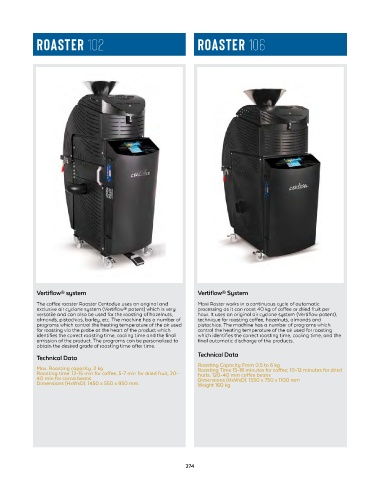 exclusive air cyclone system (Vertiflow® patent) which is very processing as it can roast 40 kg of coffee or dried fruit per of automatic processing; it has a tank capacity of 20/25Kg filled products in a single operation, including pralines on