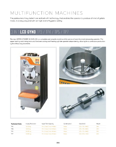 mixes, in a easy way and with an high level of hygienic safety. “3 in 1” in the four TP3, TP4, TP5 and TP7 versions is a complete laboratory intended to mix, pasteurize, cook and