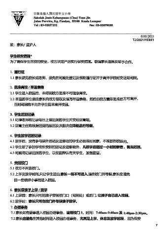 7.1 家长如有要事进入校园办理事务,请用校门 3,时间:7:40am-9:40am 及 1:40pm-2:30pm。