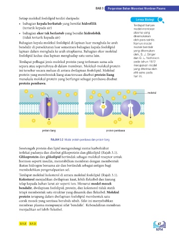 Terdapat molekul kolesterol di antara molekul fosfolipid (Rajah 3.1).