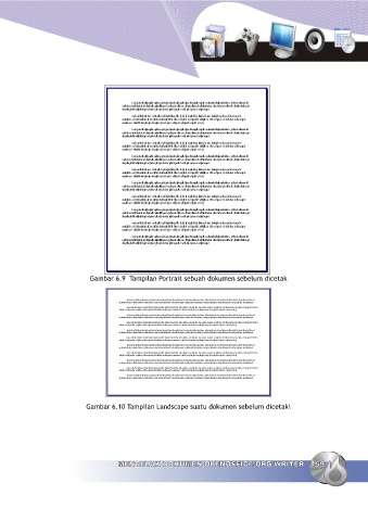 Gambar 6.9 Tampilan Portrait sebuah dokumen sebelum dicetak Gambar 6.10 Tampilan Landscape suatu dokumen sebelum dicetak\ MENCETAK DOKUMEN OPENOFFICE.ORG WRITER 159 MENCETAK DOKUMEN OPENOFFICE.ORG WRITER 159