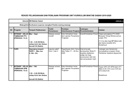 REKOD PELAKSANAAN DAN PENILAIAN PROGRAM UNIT KURIKULUM MAKTAB SABAH 2019-2020