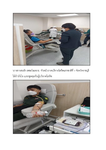 นางสาวสมรัก เพชรโฉมฉาย หัวหน้าภาคบริการโลหิตแห่งชาติที 4 จังหวัดราชบุรี ่ ให้กำลังใจ และพูดคุยกับผู้บริจาคโลหิต