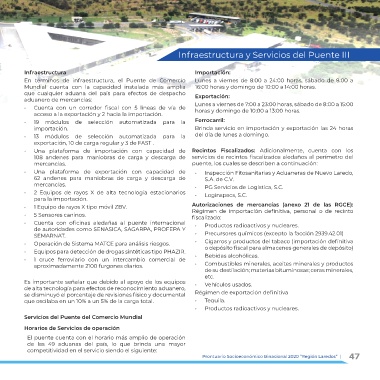 En términos de infraestructura, el Puente de Comercio Lunes a viernes de 8:00 a 24:00 horas, sábado de 8:00 a