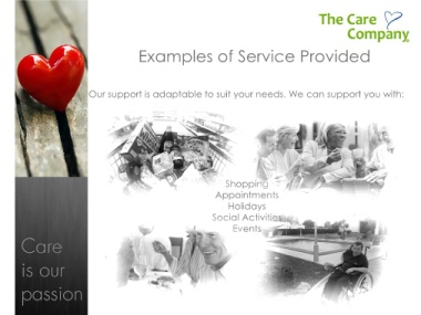 Examples of Service Provided Our support is adaptable to suit your needs. We can support you with: Shopping Appointments Holidays Social Activities Events