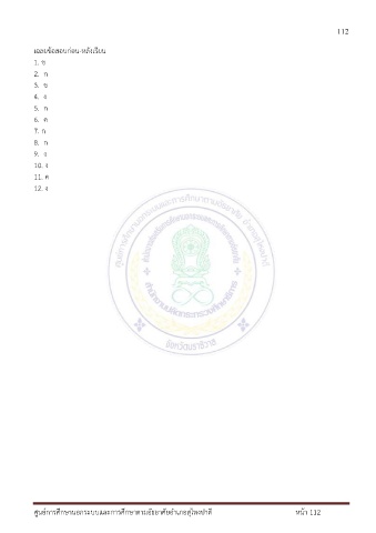 112 เฉลยข้อสอบก่อน-หลังเรียน 1. ข 2. ก 3. ข 4. ง 5. ก 6. ค 7. ก 8. ก 9. ง 10. ง 11. ค 12. ง ึ ศูนย์การศกษานอกระบบและการศึกษาตามอัธยาศัยอำเภอสุไหงปาดี หน้า 112