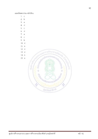 92 เฉลยข้อสอบก่อน-หลังเรียน 1. c 2. b 3. a 4. d 5. c 6. d 7. a 8. c 9. b 10. d 11. a 12. d 13. d 14. b 15. a ศูนย์การศกษานอกระบบและการศึกษาตามอัธยาศัยอำเภอสุไหงปาดี หน้า 92 ึ