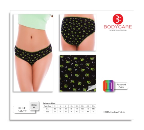 BODYCARE WOMEN’S INNERWEAR Assorted Color Reference Chart Style no. Waist Size S M L XL 2XL 3XL 4XL 5XL brief 400 Cm 80 85 90 95 100 105 110 115 panty Inch 32 34 36 38 40 42 44 46 . 100% Cotton Fabric