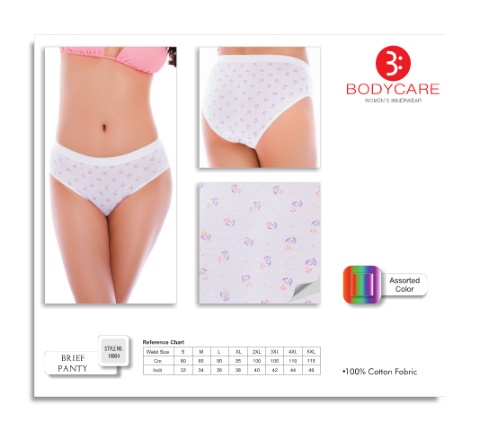 BODYCARE WOMEN’S INNERWEAR Assorted Color Reference Chart Style no. Waist Size S M L XL 2XL 3XL 4XL 5XL brief 14004 Cm 80 85 90 95 100 105 110 115 panty Inch 32 34 36 38 40 42 44 46 . 100% Cotton Fabric