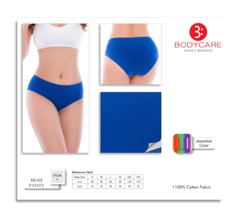 BODYCARE WOMEN’S INNERWEAR Assorted Color Reference Chart Style no. Waist Size S M L XL 2XL 3XL brief 2 Cm 80 85 90 95 100 105 panty Inch 32 34 36 38 40 42 . 100% Cotton Fabric