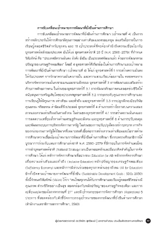 สากล (พระมหาสุพร รกฺขิตธมฺโม, 2561, น. 225-226) มีรายละเอียด ดังนี้ 1) พัฒนาการทาง การขับเคลื่อนเป้าหมายการพัฒนาที่ยั่งยืนด้านการศึกษา (เป้าหมายที่ 4) เป็นการ
