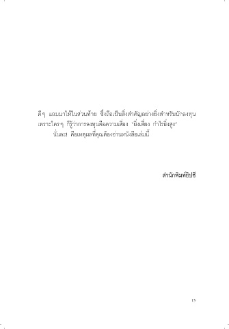 ดีๆ แถมมาให้ในส่วนท้าย ซึ่งถือเป็นสิ่งส�าคัญอย่างยิ่งส�าหรับนักลงทุน เพราะใครๆ ก็รู้ว่าการลงทุนคือความเสี่ยง “ยิ่งเสี่ยง ก�าไรยิ่งสูง” นั่นละ! คือเหตุผลที่คุณต้องอ่านหนังสือเล่มนี้ ส�านักพิมพ์ยิปซี 15