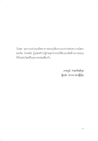 เงินสด และบอกเล่าแนวคิดทางการลงทุนที่แหวกแนวจากประสบการณ์ตรง ของจิม โรเจอร์ส ผู้แปลหวังว่าผู้อ่านทุกท่านจะได้รับแนวคิดด้านการลงทุน ที่เป็นประโยชน์ในอนาคตเช่นเดียวกัน ภาคภูมิ ก�าธรกิตติกุล ผู้แปล (จากภาษาญี่ปุ่น) 17