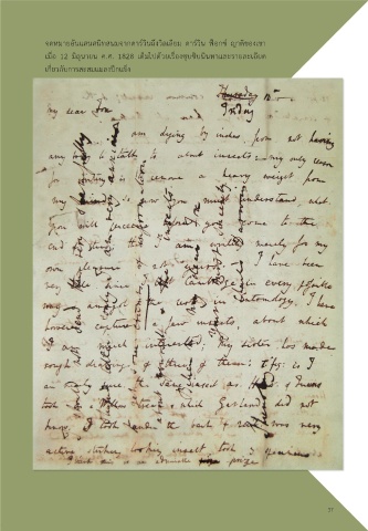 จดหมายอันแสนสนิทสนมจากดาร์วินถึงวิลเลียม ดาร์วิน ฟ็อกซ์ ญาติของเขา ื ื เม่อ 12 มิถุนายน ค.ศ. 1828 เต็มไปด้วยเร่องซุบซิบนินทาและรายละเอียด เกี่ยวกับการสะสมแมลงปีกแข็ง 37